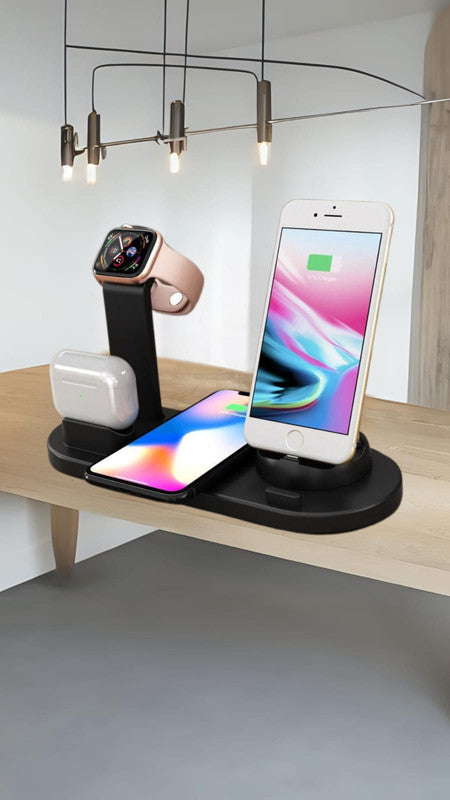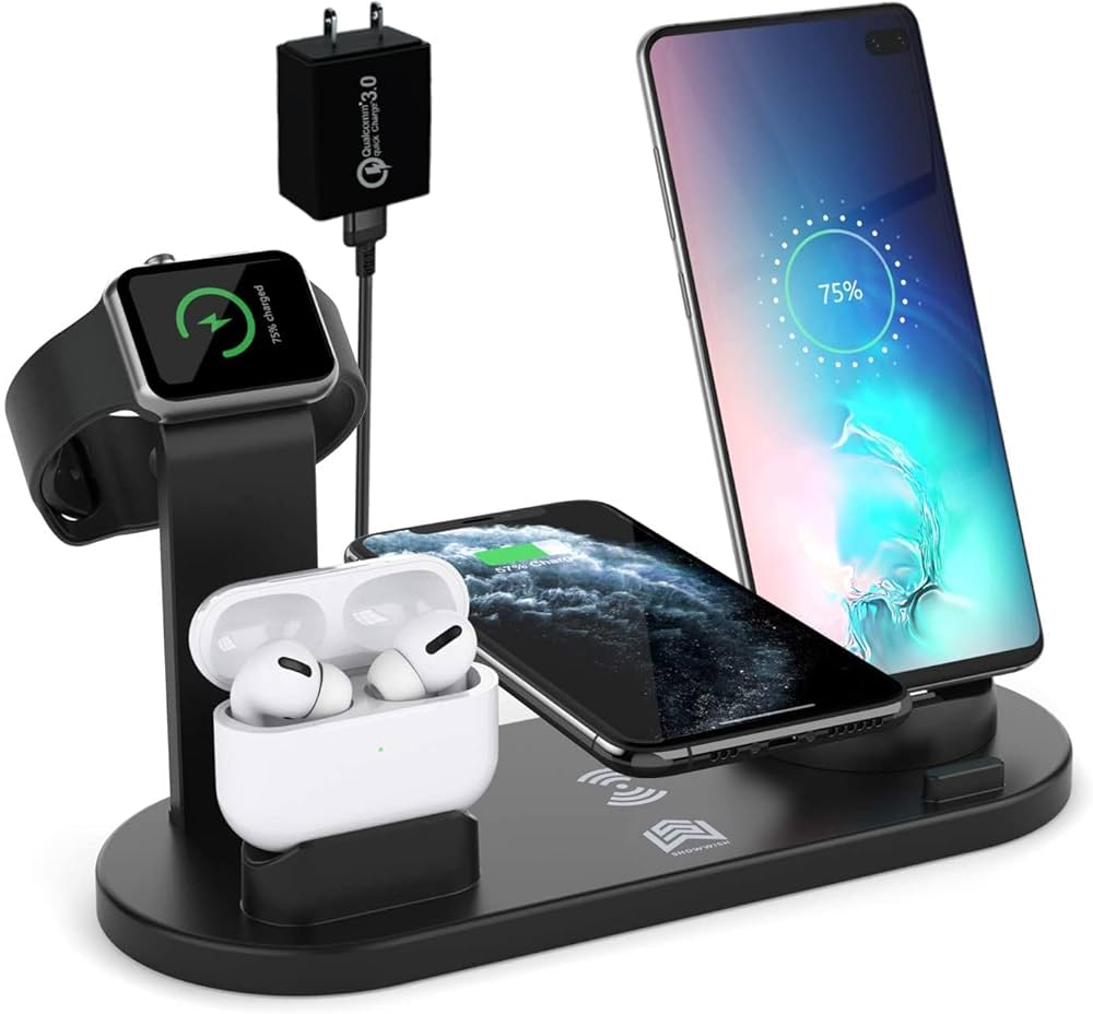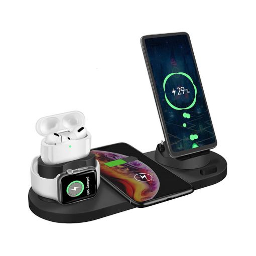 • Cargador inalámbrico: Cargue varios dispositivos simultáneamente con este versátil cargador inalámbrico. • Carga rápida:Disfrute de velocidades de carga rápidas para su iPhone, Smarphone, Apple Watch, Airpods y otros dispositivos. • Conector tipo C: El conector tipo C garantiza una conexión fácil y rápida a sus dispositivos. • Conector tipo Iphone: Este cargador es compatible con una amplia gama de dispositivos Apple, incluidos los últimos modelos de iPhone 14. • Soporte para Cable de Carga:El soporte incorporado mantiene su cable de carga organizado y fácilmente accesible. • Carga Inalàmbrica: Retirar la carcasa de tu celular y disfruta de la carga inalámbrica *Sin cargador de Apple Watch, la carga de Apple Watch necesita instalar usted mismo el cargador de reloj original. Nueva versión de actualización: 1.Actualizado a cargador rápido. 2. Puerto de salida dual USB + tipo C trasero incorporado. 3.Compatible con todos los Airpods Pro y Apple Watch. 4.Agregue el soporte del Apple Watch y luego se cargará de manera más normal y eficiente que otros. 5. Amplamente compatible, la estación de carga inteligente combina un cargador inalámbrico rápido Qi con un cargador de base de 3 conectores, iWatch, un cargador de Airpods y una toma USB en un solo soporte, admite la carga de su Apple Watch, Airpods, iPhone/Samsung simultáneamente.La base de los 3 conectores es giratoria en 360°, Adecuado para teléfonos móviles iPhone, Android Type-c y Android Micro-usb. Puerto de salida dual USB + tipo C trasero incorporado (uno para reloj y otro para teléfono).Para que puedas cargar 5 dispositivos al mismo tiempo.